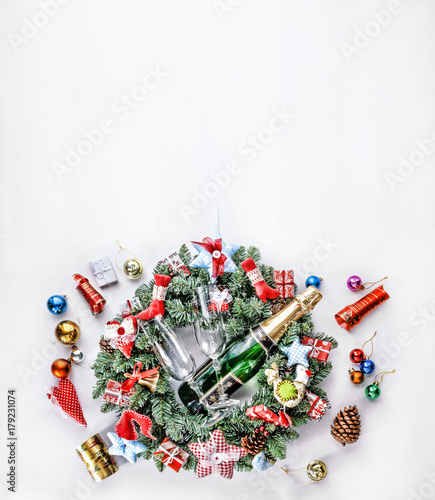 New Year Christmas Champagne Christmas Decorations Multi Colored Balls And Gifts With A Christmas Tree Buy This Stock Photo And Explore Similar Images At Adobe Stock Adobe Stock